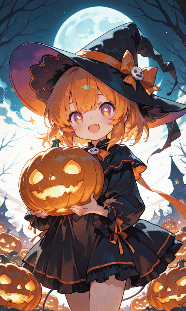 little girl,halloween costume, holding, Jack-o’-lantern,night,moon, smile,open mouth, cowboy shot,simplebackground,white background, masterpiece,high quality, high resolution,hyper-detailed, high contrast, depth of field, ray tracing, best lighting, cinematic composition, beautiful face, beautiful eyes, sharp focus, (masterpiece:1.2), (best quality:1.2), (very aesthetic:1.2), (absurdres:1.2), (detailed background),tokiame, Fantasy Scene, ,chibi, big_head, small_body, large_eyes, blush, simple_lines, bright_colors, simple_colors, cute