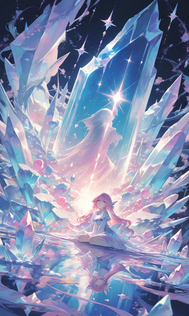 PixAI【Shiitake-Mix】big crystal,oversized crystal,1girl,solo,wariza,cowboy shot, young beautiful girl trapped inside towering pink crystal pillars forming a natural cage, massive rose quartz columns with inner glow, pink translucent crystals reflecting light, floating crystal shards around her, sorrowful yet elegant expression, white flowing dress torn slightly, dramatic pink and violet lighting, dark background, fantasy art, cinematic composition, intricate details, masterpiece, very detailed,high-res,♡masterpiece, highest quality, ♡, Fantasy Scene, ,cinematic lighting , cinematic angle, soft light , color detail, backlighting, Depth of field, long exposure, light steps, intricate colors, vibrant colors,