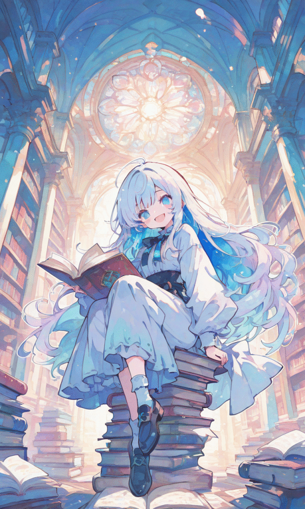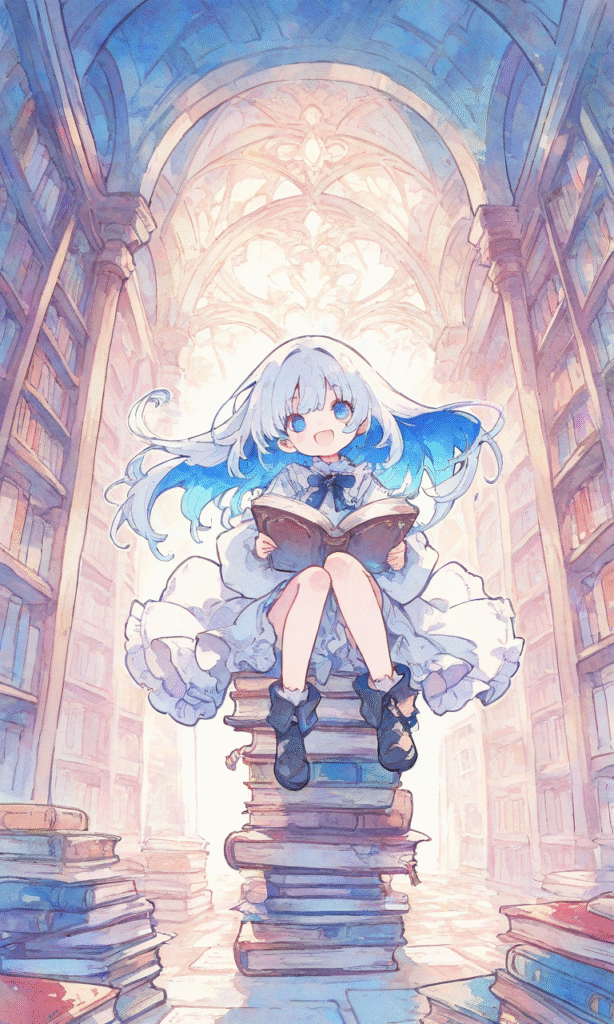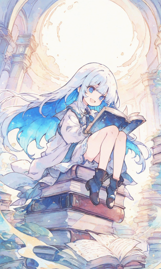 1girl, little girl, sitting on stacks of books, reading book, smile, open mouth, full body, library, masterpiece, high resolution, flatline, flat vector illustration, vivid colors, white thick outline, outline, blue inner hair color, watercolor, soft light, tokiame, fantasy scene, high-res