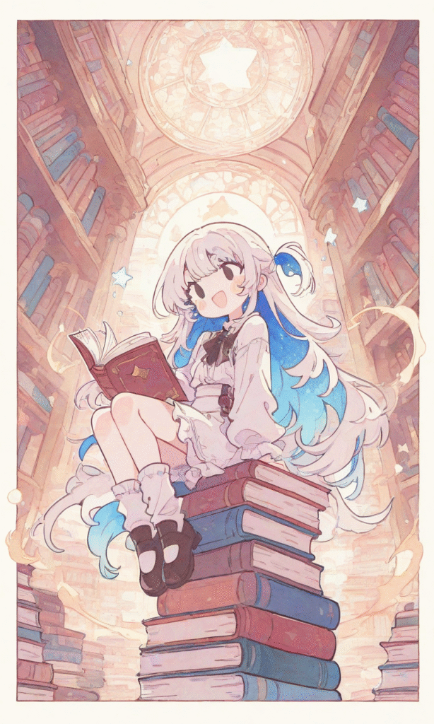 1girl, little girl, sitting on stacks of books, reading book, smile, open mouth, full body, library, masterpiece, high resolution, flatline, flat vector illustration, vivid colors, white thick outline, outline, blue inner hair color, watercolor, soft light, tokiame, fantasy scene, high-res, white border, ultra detailed, extremely hyper pastel coloring, style, minimal linework, glowing eyes, halftones, white star pupils, pop art, hard cell shading, extreme foreshortening, cartoony, toonish, moe style, (circle head: 1.2), (oval eyes: 1.4), vibrant background