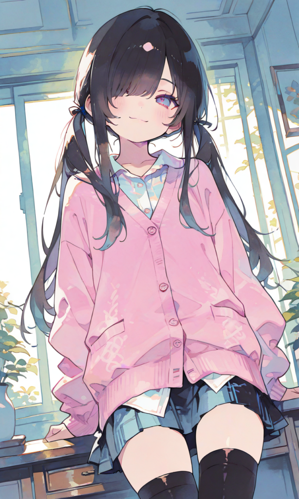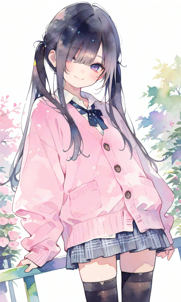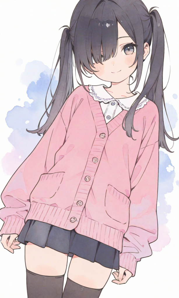 PixAI【Shiitake-Mix】little girl,loli,solo,black hair,Thin twintails,long twintails, straight hair, hair over one eye,pink cardigan,miniskirt,black thighhighs, smile,cowboy shot, masterpiece,high quality, high resolution,high-res,(watercolor_(medium):1.2)(simple coloring,flat color:2)dutch angle,748cmstyle,hyper-detailed, high contrast, depth of field, ray tracing, best lighting, cinematic composition, beautiful face, beautiful eyes, sharp focus, (masterpiece:1.2), (best quality:1.2), (very aesthetic:1.2), (absurdres:1.2), (detailed background),