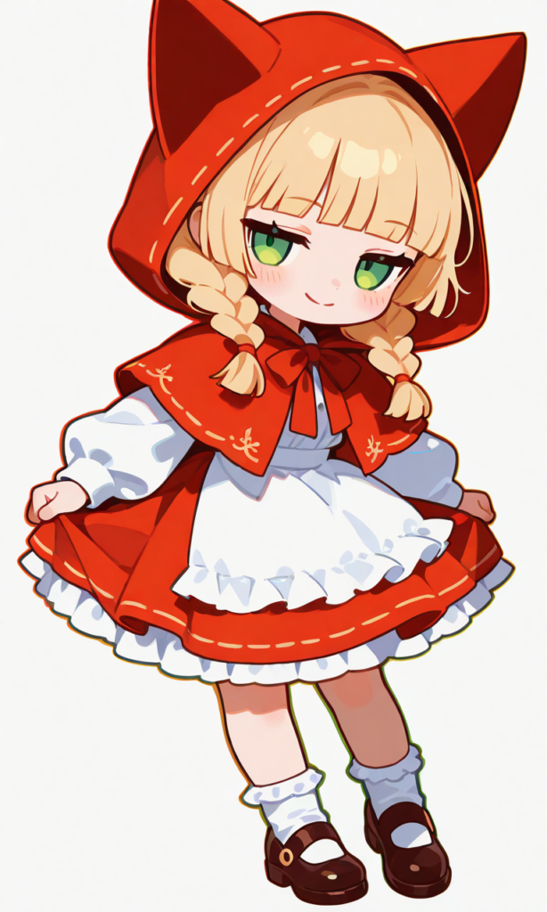 Grimm’s Fairy Tales,colored lineart,colored outline,chibi, Little Red Riding Hood,little girl,(((solo))), blonde hair, twin braids, blunt bangs,jitome,green eyes, cat ears hood,dress,ankle socks, shoes,looking at viewer,smile,full body,simple background, white background, masterpiece,high quality, high resolution,high-res,