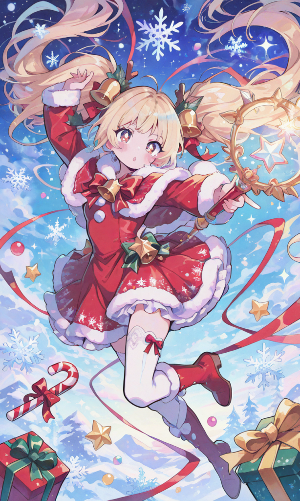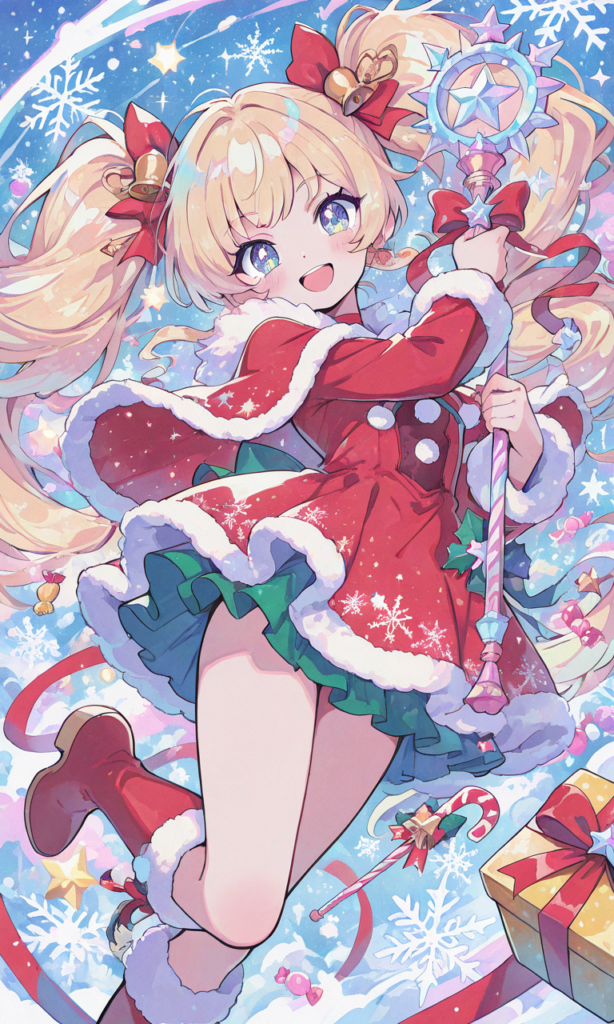 1girl, loli, solo, blonde hair, smile, open mouth, looking at viewer, magical girl, santa claus inspiration, twintails, red ribbons, bells, sparkling eyes, frilly red dress, fur trim, short skirt, thighhigh boots, candy cane patterns, magical wand, star, gift bow, dynamic pose, holiday magic, sparkles, snowflakes, kawaii, vibrant colors, detailed, anime art, high quality, christmas atmosphere, fantasy scene, highres, neon pop art style, masterpiece, highest quality