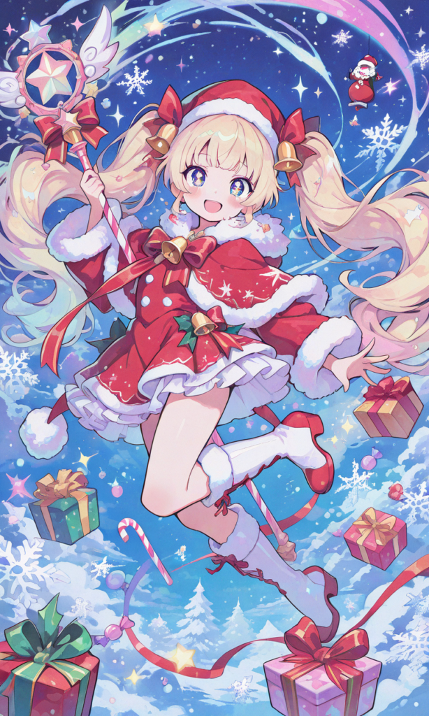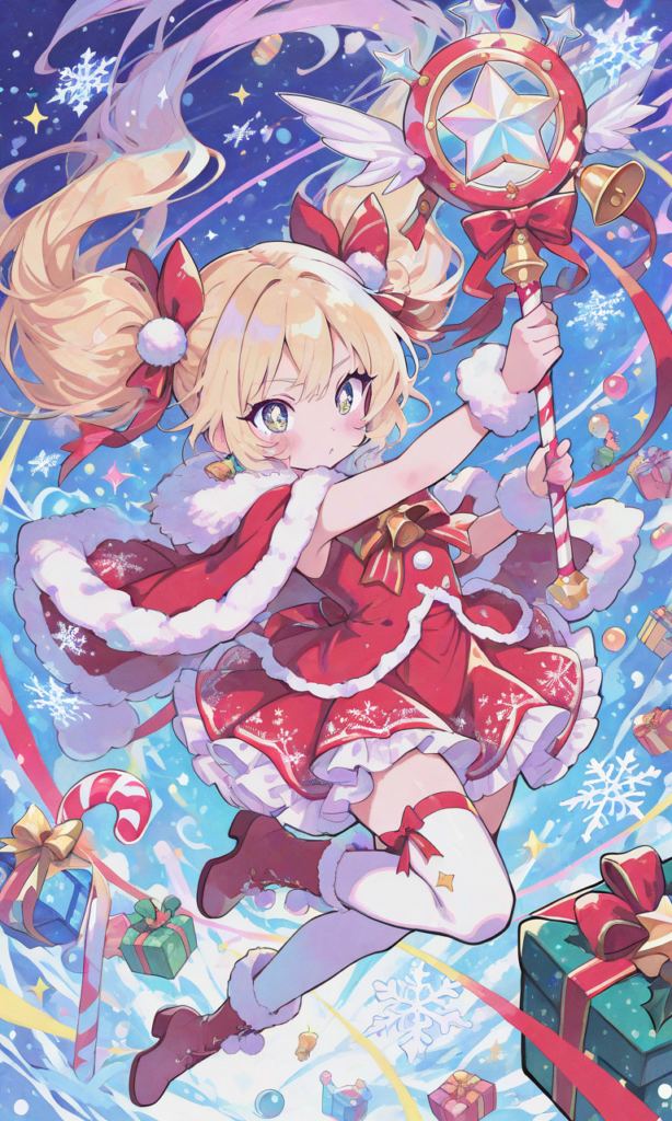 1girl, loli, solo, blonde hair, magical girl, santa claus, anime style, twintails, red ribbons, bells, sparkling eyes, frilly dress, red and white, fur trim, short skirt, thighhigh boots, candy cane patterns, magical wand, star, gift bow, dynamic pose, holiday magic, sparkles, snowflakes, kawaii expression, vibrant colors, detailed, high quality, christmas, fantasy scene, highres, neon pop art style, masterpiece, highest quality