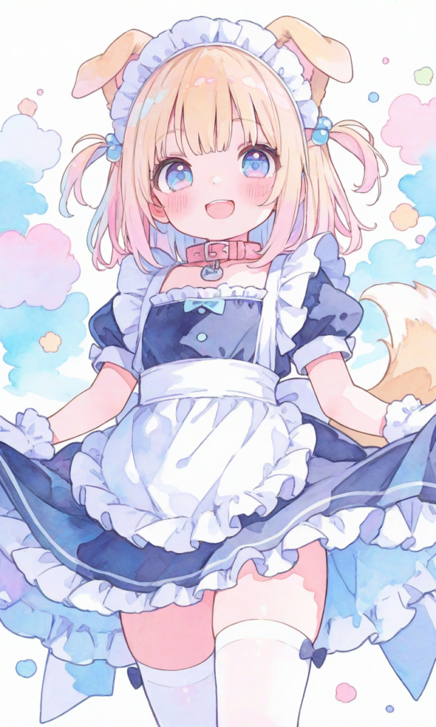 PixAI【Shiitake-Mix】little Girl,loli,solo,dog ears, maid,white gloves, white thighhighs, collar,smile,open mouth,cowboy shot,masterpiece,high resolution,high quality, ,high-res,watercolor, sketch style, watercolor effect, pastel colors