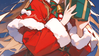 PixAI【Shiitake-Mix】girl,brown hair, santa costume,hat, pantyhose, smile,open mouth,holding present, looking at viewer, ...