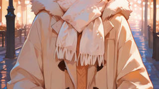 PixAI【Shiitake-Mix】A young woman walking on a snowy cobblestone street in Europe at night, wearing a fluffy cam...
