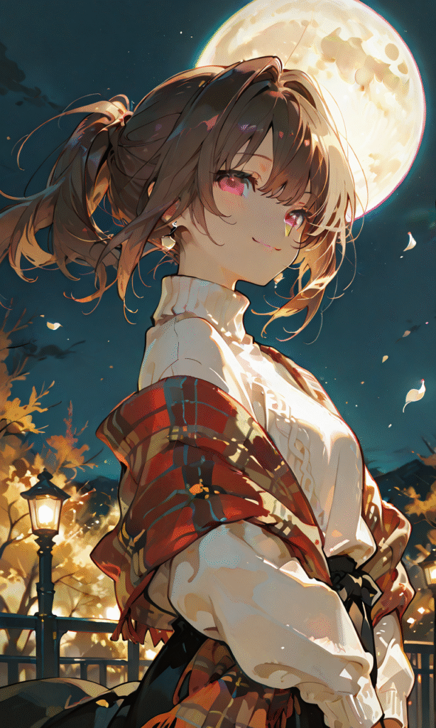 PixAI【Shiitake-Mix】1girl, brown hair, ponytail, hair intakes, white turtleneck sweater, plaid shawl, long skirt, moon-shaped earrings, looking at twilight sky, cowboy shot, night, drifting petals, soft wind, dreamy atmosphere, pastel tones, smile, upper body, autumn, masterpiece, high quality, high resolution, hyper-detailed, high contrast, depth of field, ray tracing, best lighting, cinematic composition, beautiful face, beautiful eyes, sharp focus, (masterpiece:1.2), (best quality:1.2), (very aesthetic:1.2), (absurdres:1.2), detailed background, tokiame, 748cmstyle, yoneyama mai, solo, looking at viewer, blurry, chromatic aberration, portrait, close-up