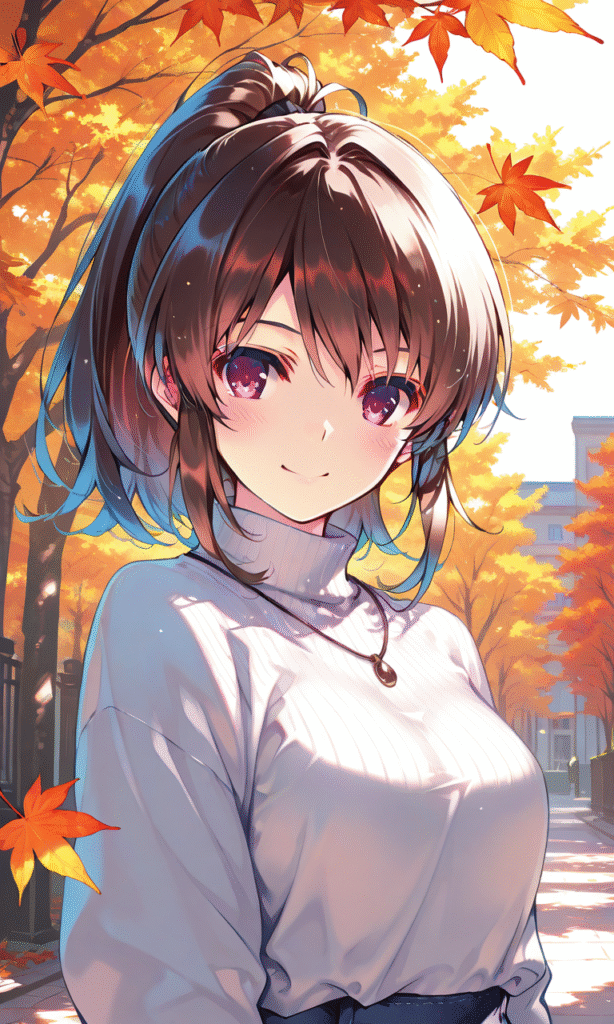 misaki kurehito (style), girl,brown hair, ponytail,hair intakes,white turtleneck sweater, necklace,smile,upper body,autumn, masterpiece,high quality,high resolution ,hyper-detailed, high contrast, depth of field, ray tracing, best lighting, cinematic composition, beautiful face, beautiful eyes, sharp focus, (masterpiece:1.2), (best quality:1.2), (very aesthetic:1.2), (absurdres:1.2), (detailed background),tokiame