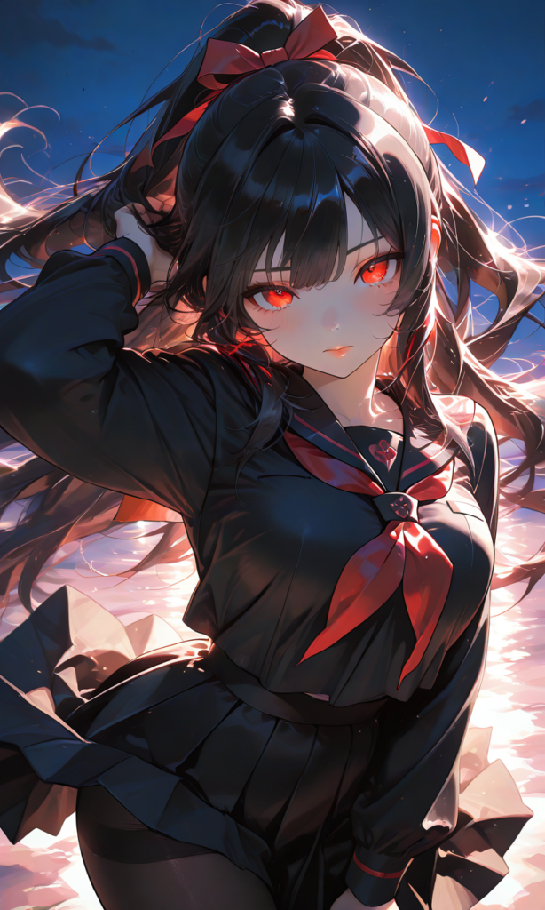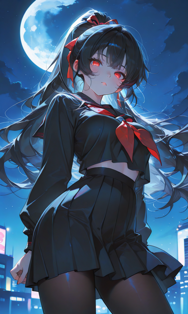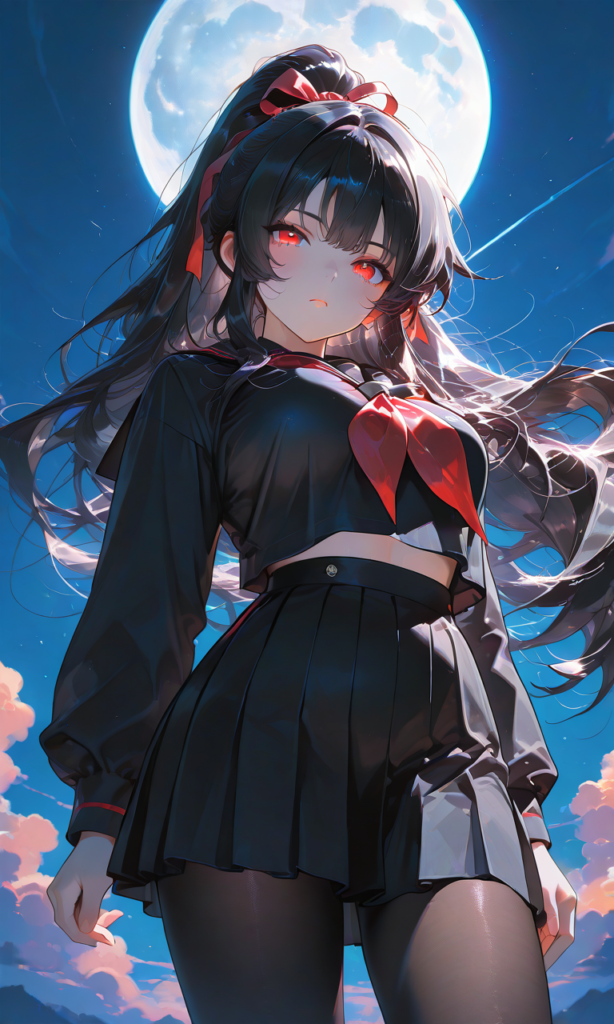 1girl, high ponytail, black hair, upturned eyes, large breasts, black serafuku, long sleeves, red neckerchief, hair ribbon, serious expression, pantyhose, moon, night sky, from below, masterpiece, high resolution, high quality, high-res, ♡masterpiece, highest quality, ♡, hyper-detailed, high contrast, depth of field, ray tracing, best lighting, cinematic composition, beautiful face, beautiful eyes, sharp focus, (masterpiece:1.2), (best quality:1.2), (very aesthetic:1.2), (absurdres:1.2), (detailed background)