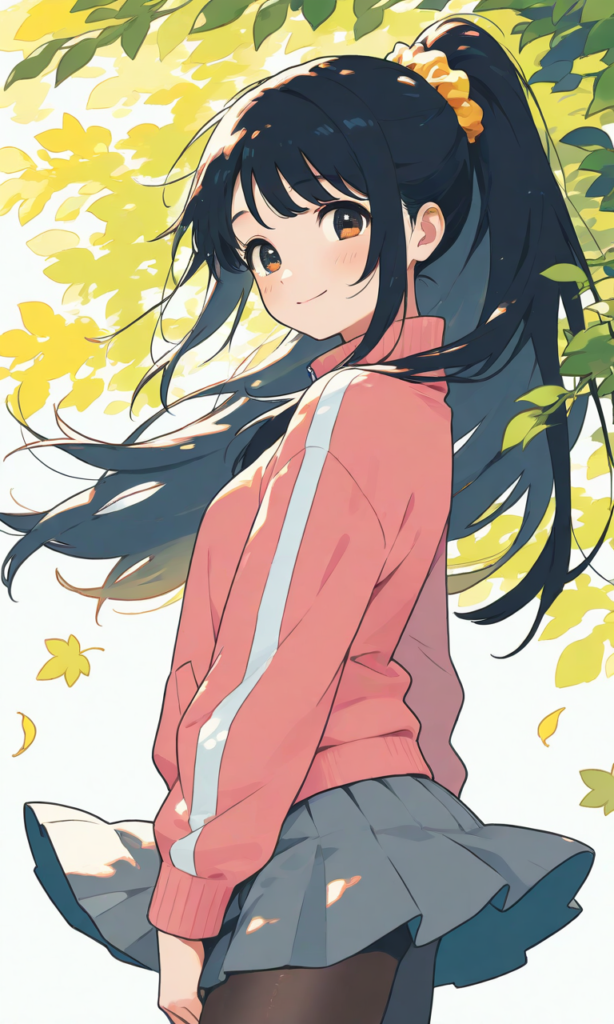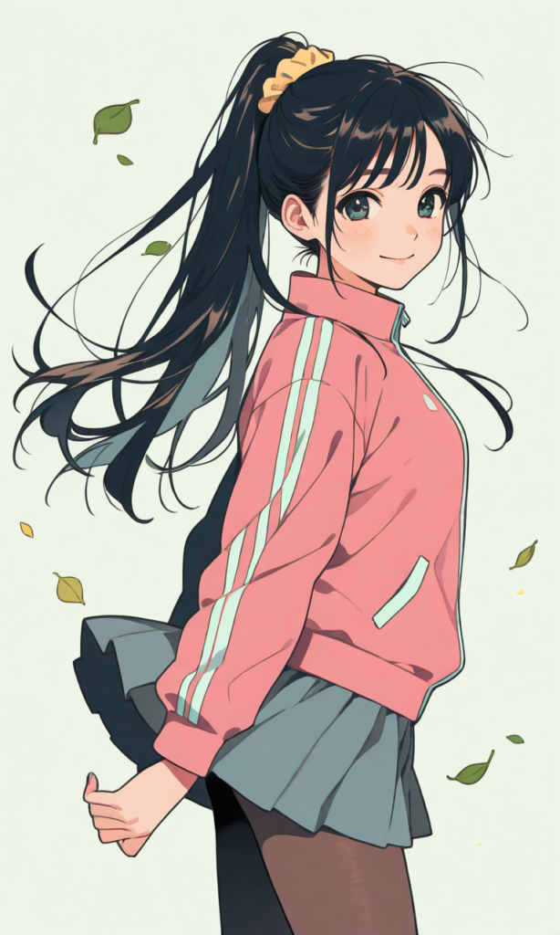 PixAI【Shiitake-Mix】flat color, cel shading, girl,solo,black hair, long hair,straight hair,ponytail, tareme,pink track suit,gray miniskirt, pantyhose,hair scrunchie, looking at viewer,smile,from side, cowboy shot,simple background, green leaf,wind lift,masterpiece,high quality, high resolution,high-res,Simple coloring, limited color palette, grainy texture, color contrast, complementary colors, defined shading,[Watercolor], soft lines, harmonious color palette