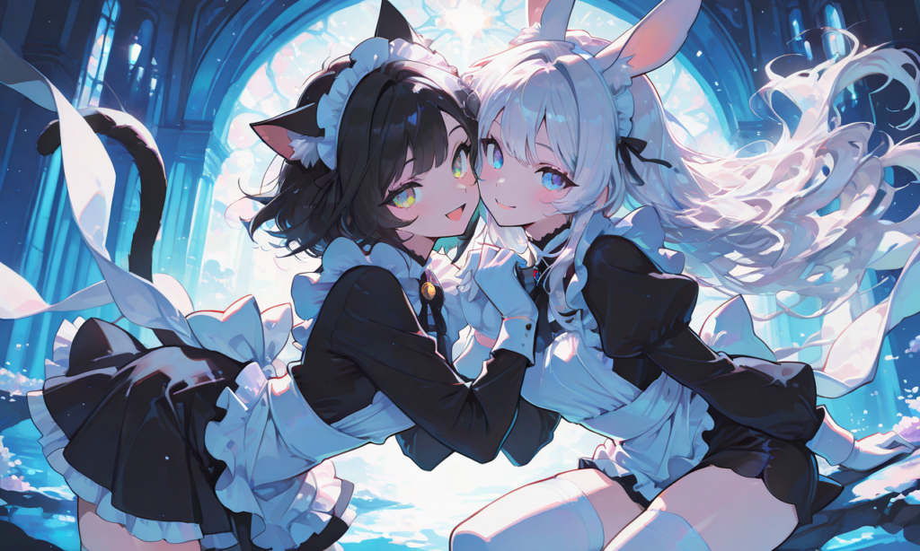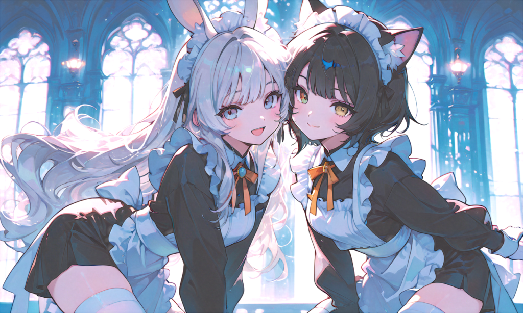 PixAI【Shiitake-Mix】2girls,maid, white thighhighs, long sleeves, white gloves, smile,open mouth, cowboy shot,simplebackground,masterpiece,high quality, high resolution,yuri