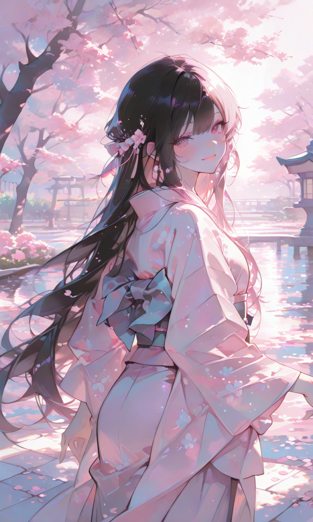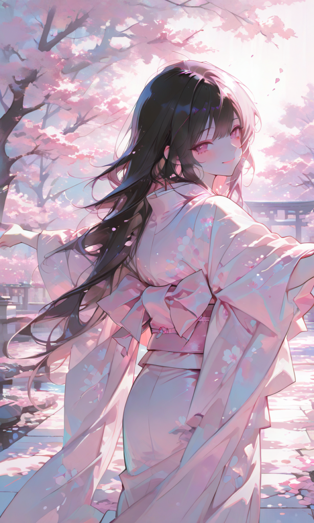 PixAI【Shiitake-Mix】1girl, beautiful japanese girl with long flowing black hair, gentle smile, wearing elegant pale pink kimono in sakura-iro and usuzakura, cherry blossom petals falling around her, soft pastel pink and white color scheme, traditional japanese garden in spring, warm sunlight filtering through cherry trees, cowboy shot,looking back, ((spread arms)), arms up, highly detailed face, delicate expression, serene atmosphere, traditional japanese art style with modern anime influence, masterpiece, best quality,((4k,8k,Ultra HD)),((Masterpiece :1.2)),((Best quality :1.2)),((Detailed :1.5)),((Detailed background :1.5)),