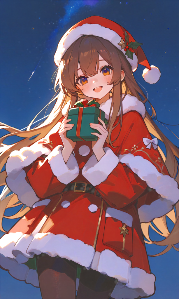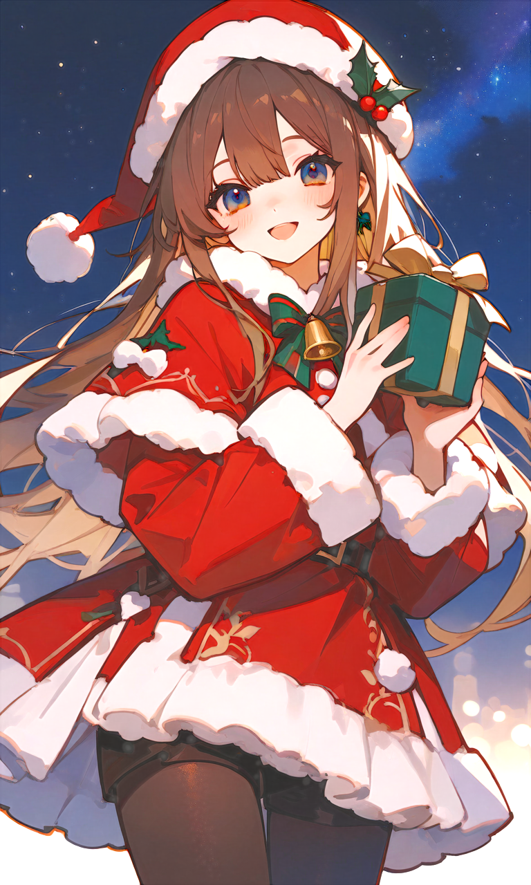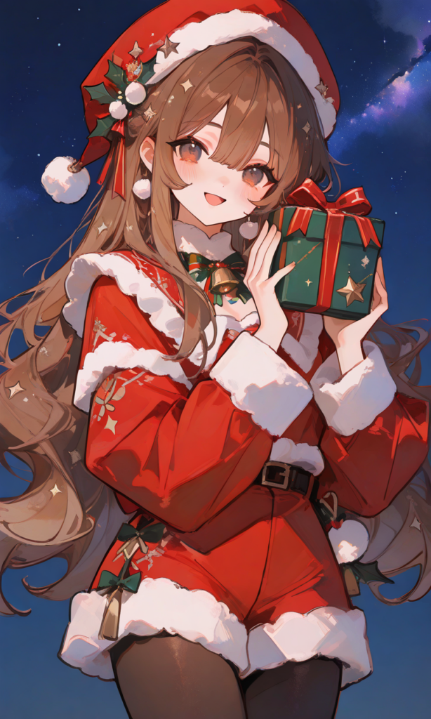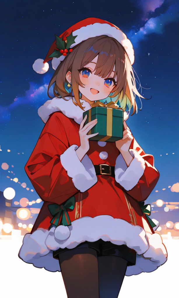 PixAI【Shiitake-Mix】girl,brown hair, santa costume,hat, pantyhose, smile,open mouth,holding present, looking at viewer, cowboy shot,night sky,starry sky,simple background, masterpiece,high quality, high resolution,clndl_style,high-res,748cmstyle,cinematic lighting , cinematic angle, soft light , color detail, backlighting, Depth of field, long exposure, light steps, intricate colors, vibrant colors,