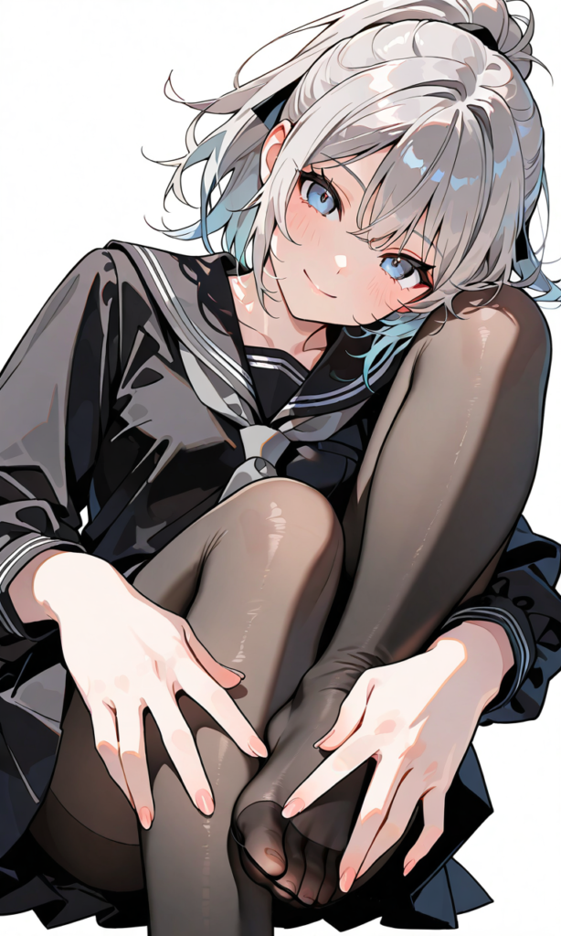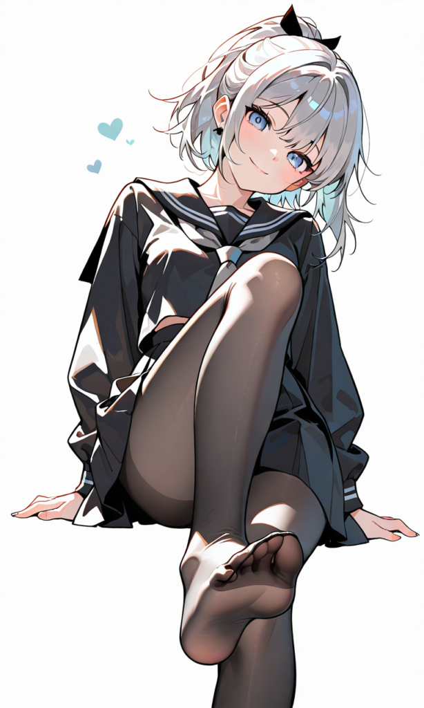 1girl,((solo)), gray hair,ponytail,short hair, black serafuku, long hair, gray necktie,pantyhose,smile, looking at viewer, leg focus, perfect delicate leg, high detail toes, soft skin, elegant foot pose, detailed foot wrinkles, soft natural lighting, white background, masterpiece, best quality, ultra detailed,high-res,♡masterpiece, highest quality, ♡