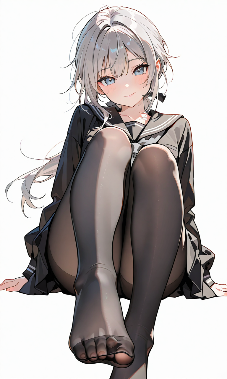 1girl,((solo)), gray hair,ponytail,short hair, black serafuku, long hair, gray necktie,pantyhose,smile, looking at viewer, leg focus, perfect delicate leg, high detail toes, soft skin, elegant foot pose, detailed foot wrinkles, soft natural lighting, white background, masterpiece, best quality, ultra detailed,high-res,♡masterpiece, highest quality, ♡