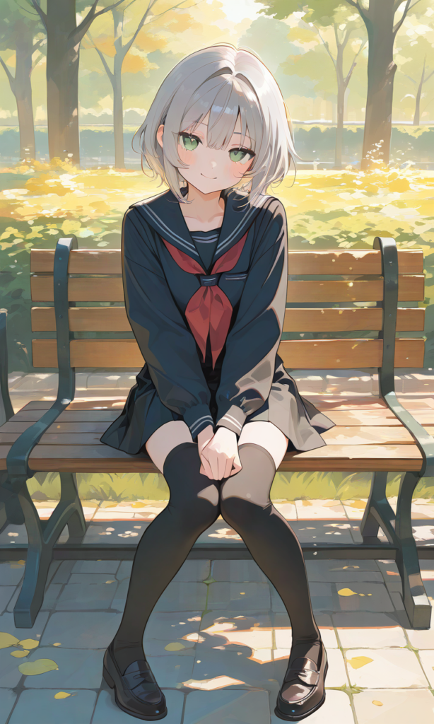 PixAI【Shiitake-Mix】girl,gray hair,short hair, green eyes, jitome, serafuku,miniskirt,red neckerchief, black thighhighs,((knees together feet apart)),pigeon-toed, smile,looking at viewer, sitting, bench,park,hedge, full body,from below, masterpiece,high quality, high resolution,high-res,♡masterpiece, highest quality, ♡,hyper-detailed, high contrast, depth of field, ray tracing, best lighting, cinematic composition, beautiful face, beautiful eyes, sharp focus, (masterpiece:1.2), (best quality:1.2), (very aesthetic:1.2), (absurdres:1.2), (detailed background),