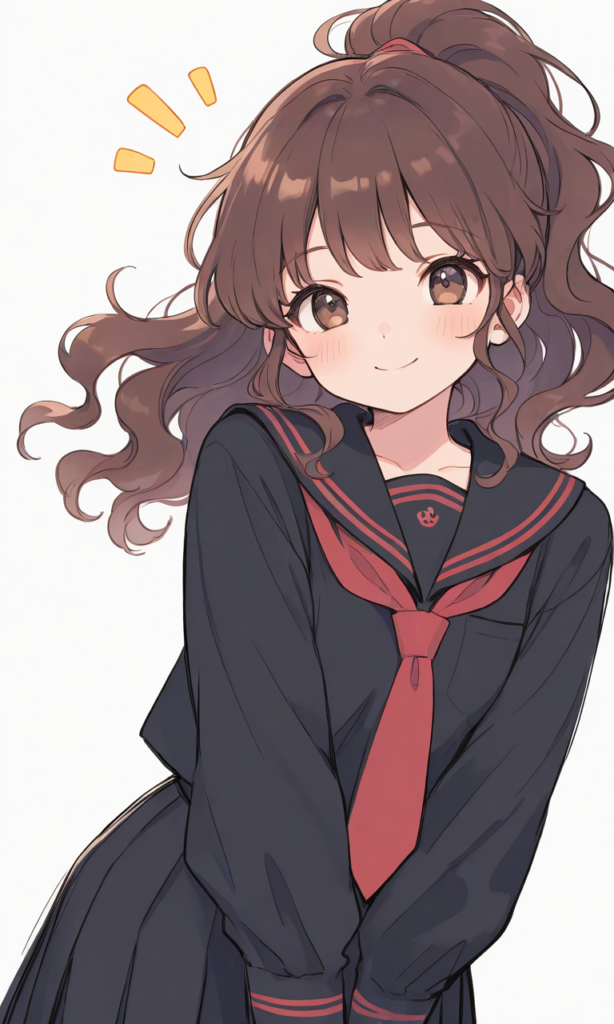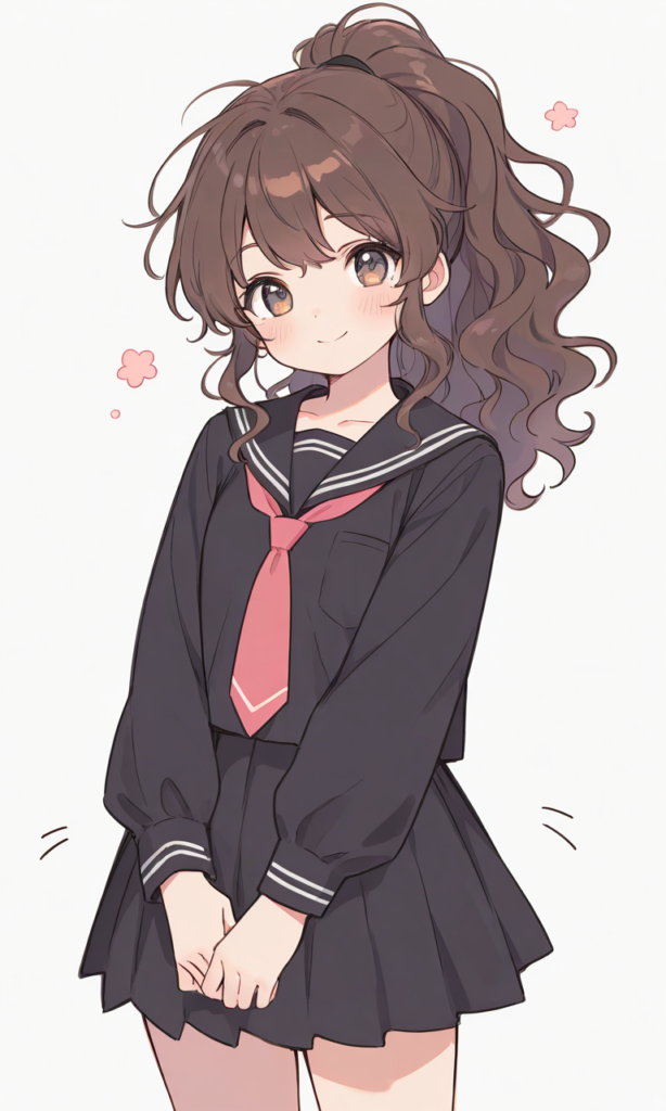 1girl, brown hair, ponytail, wavy hair, black serafuku, necktie, smile, cowboy shot, simple background, white background, masterpiece, high quality, high resolution, high-res, solo, cute, pencil lines, sketch, kawaii