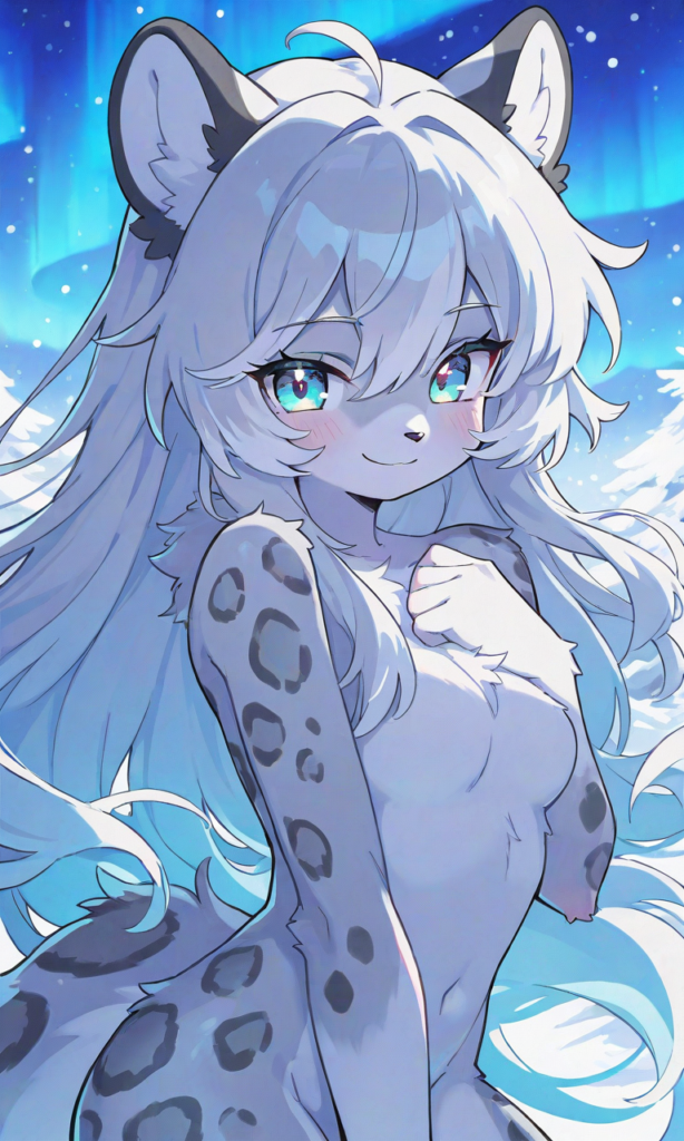 PixAI【Shiitake-Mix】girl,snow leopard ears, long flowing silver-white hair with subtle gray highlights,((furry body)),nude,big expressive turquoise eyes sparkling with curiosity, gentle confident smile, aurora lights, high detail, vibrant yet serene colors, anime style illustration, high resolution, magical winter atmosphere, adorable and elegantanthropomorphic snow leopard girl in full furry anthro style,cowboy shot,masterpiece,high resolution,high quality, ,neon pop art style,♡masterpiece, highest quality, ♡