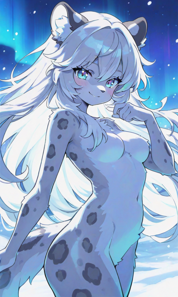 girl,snow leopard ears, long flowing silver-white hair with subtle gray highlights,furry body,nude,big expressive turquoise eyes sparkling with curiosity, gentle confident smile, aurora lights, cool blue and white color palette with soft glow, high detail, vibrant yet serene colors, anime style illustration, high resolution, magical winter atmosphere, adorable and elegantanthropomorphic snow leopard girl in full furry anthro style,cowboy shot,masterpiece,high resolution,high quality, ,neon pop art style