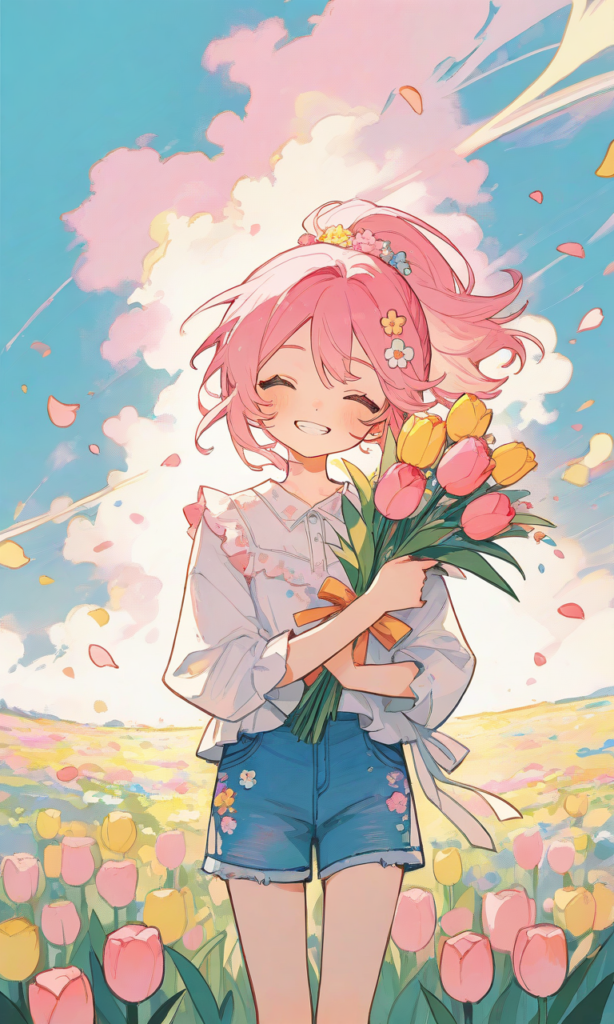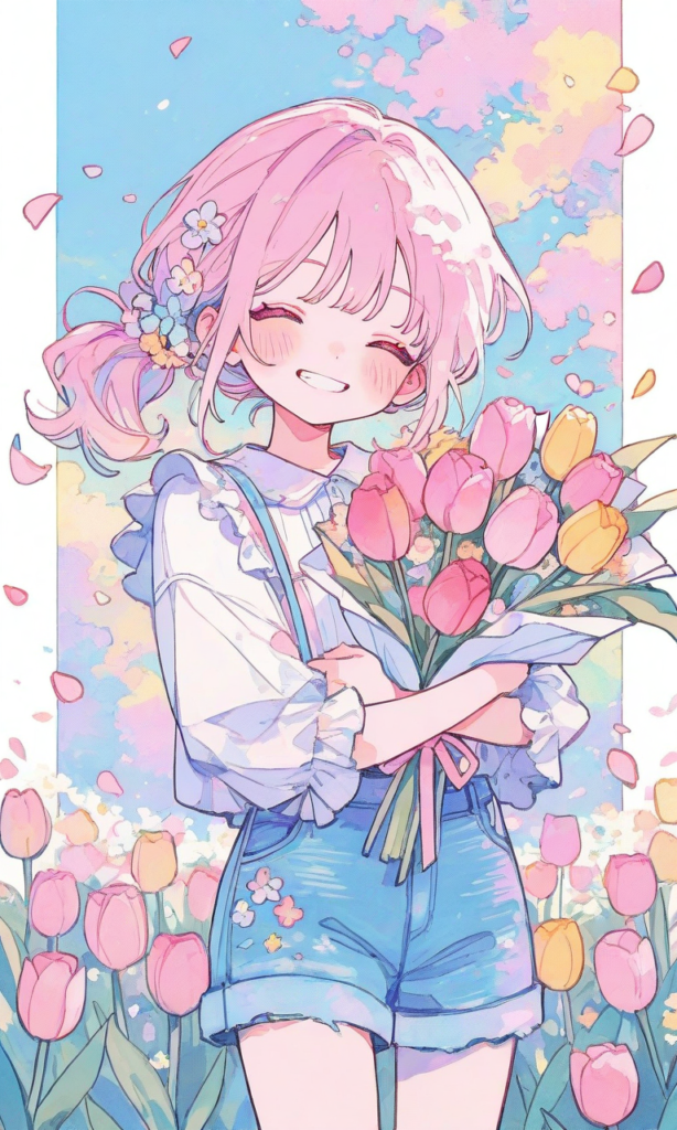 little girl,ponytail, pink hair, energetic smile, wearing casual white shirt and denim shorts with flower accessories, while holding big colorful spring bouquet, cowboy shot,closed eyes, clenched teeth,
