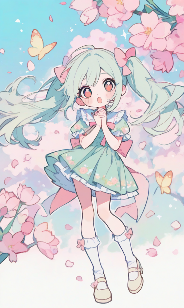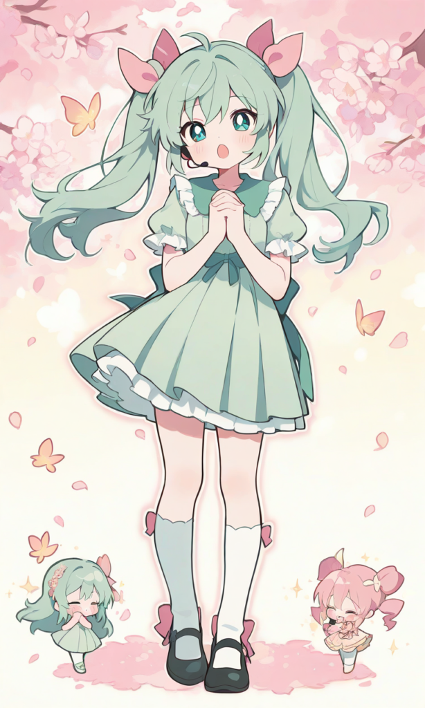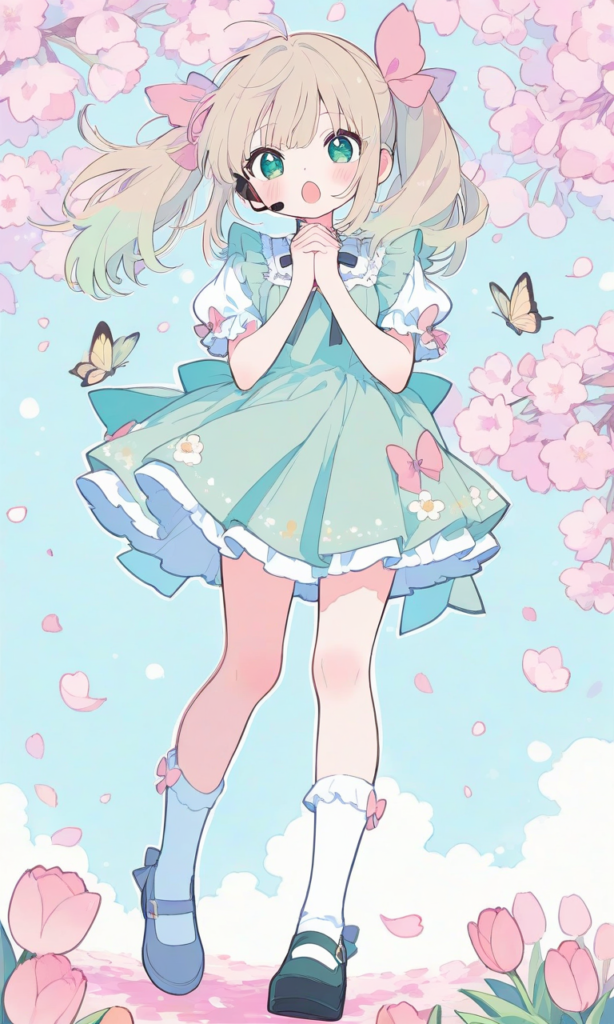 PixAI【Shiitake-Mix】Cute anime girl performing a spring song outdoors, wearing an ultra girly pastel yellow and mint green dress with lots of frills, ribbons, and puff sleeves, short pleated skirt with flower embroidery, white knee socks and mary jane shoes, twintails with large pink bows, open mouth singing happily, microphone in hand or hands clasped near chest, surrounded by blooming cherry blossoms, tulips, and butterflies, bright spring day, wind gently blowing her hair and dress, kawaii anime style, sparkling effects, highly detailed clothing and flower petals, soft bokeh background,high-res,{masterpiece},{chibi} ,{chibi style anime illustration},{Deformed},{best quality}, {illustration},{thick outline},{outlined vector graphics},{2d cel anime},{flat color style},{simple coloring style},Only one person depicted, big eyes, a short limbs,watercolor, sketch style, watercolor effect, pastel colors,Simple coloring, limited color palette, grainy texture, color contrast, complementary colors, defined shading