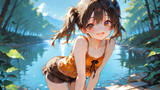 AI 8/12 HAPPY BIRTHDAY 阿澄佳奈『ヤマノススメ』倉上ひなた PixAI【Shiitake-Mix】kuraue hinata,brown eyes,twintail, smile,open mouth, cowboy shot,orange camisole,shorts,river,summer... 2025.09.30 AIHAPPY BIRTHDAY声優