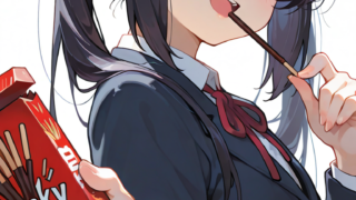 PixAI【Shiitake-Mix】nakano azusa, school uniform,blazer, holding pockybox, eating, pocky, smile,open mouth, upper body, ...