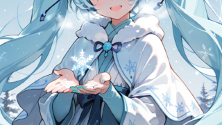 PixAI【Shiitake-Mix】hatsune miku, ((((light blue hair)))), ((yuki miku)), smile, open mouth, cowboy shot, simple backgro...
