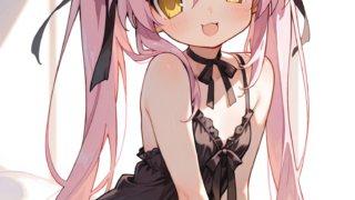PixAI【Shiitake-Mix】little Girl,lucky star,pink hair, twintail,yellow eyes, black neckribbon,black negligee,wariza,s...