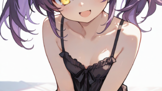 PixAI【Shiitake-Mix】little Girl,purple hair, twintail,yellow eyes, black neckribbon,black negligee,wariza,smile, open mo...