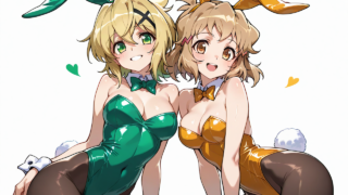 PixAI【Shiitake-Mix】2girls,tainaka ritsu, oumae kumiko, smile,open mouth, bunny girl,cowboy shot,simplebackground,wh...