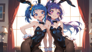PixAI【Shiitake-Mix】2girls, precure, sora harewataru(side ponytail, blue eyes), izayoi liko(ponytail, purple eyes), bunn...