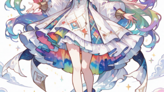 PixAI【Shiitake-Mix】A graceful girl walking atop a glowing rainbow arch that stretches across a dreamy twilight sky. She...