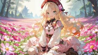PixAI【Shiitake-Mix】girl,elf,solo,blonde hair, long hair,parted bangs,green eyes, flat chest,smile,open mouth, wariza,co...