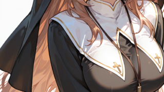 PixAI【Shiitake-Mix】inui shinju, 1woman, large breasts, long hair, smile, tareme, nun, cowboy shot, simple background, w...