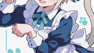PixAI【Shiitake-Mix】shiomi syuko, 1girl, white maid, cat ears, lucky cat pose, smile, open mouth, cowboy shot, simpl...