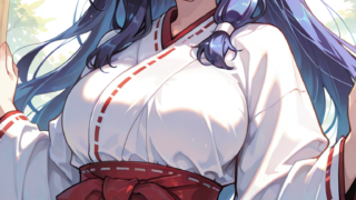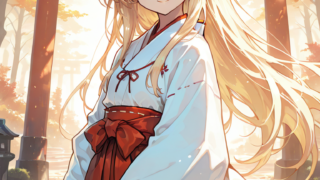 PixAI【Shiitake-Mix】asama tomo,smile,open mouth,miko,heterochromia, brown eyes, green eyes, cowboy shot,simplebackground...
