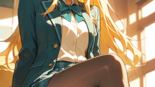 PixAI【Shiitake-Mix】fox girl, blonde hair, long hair, tsurime, school uniform, blazer,plaid skirt,pantyhose,smile,open m...