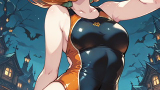 PixAI【Shiitake-Mix】Jack-o'-lantern,pumpkin head girl,orange&black competition swimsuit,looking at viewer,Sexy pose,...