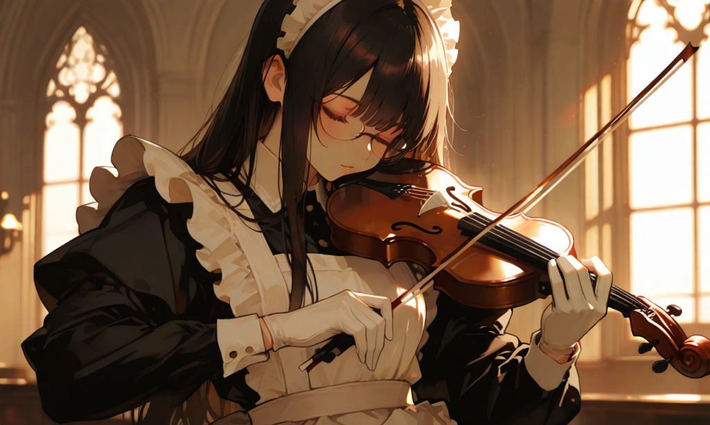 PixAI【Shiitake-Mix】1girl,black hair,long hair,straight hair,brown eyes, maid,long skirt,maid headdress, white gloves, long sleeves, glasses,playing violin,closed eyes, upper body, standing, simplebackground,masterpiece,high quality, high resolution,high-res,748cmstyle,♡masterpiece, highest quality, ♡,hyper-detailed, high contrast, depth of field, ray tracing, best lighting, cinematic composition, beautiful face, beautiful eyes, sharp focus, (masterpiece:1.2), (best quality:1.2), (very aesthetic:1.2), (absurdres:1.2), (detailed background),